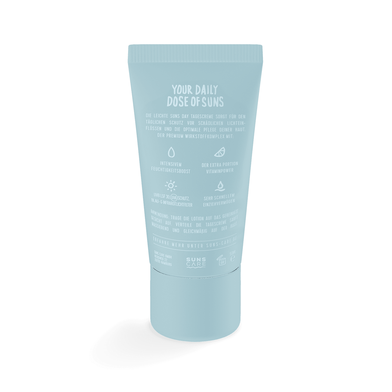 De lichte SUNS DAY dagverzorging biedt uitgebreide bescherming tegen UV-schade in het dagelijks leven en voorziet uw huid van vocht en vitamines door 8 krachtige ingrediënten – elke dag!