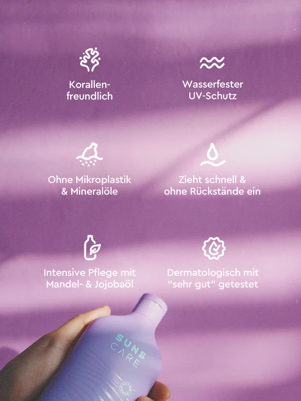 Suns Care Fifty Waterproof met SPF 50 geeft volledige bescherming tegen schadelijke effecten van zonlicht en verzorgt je huid zonder witte waas achter te laten. Deze snel intrekkende lotion biedt een hoge UVA/UVB breedspectrumbescherming dankzij evenwichtig samengestelde UV-filters. Het bevat een hoogwaardige combinatie van verzorgende ingrediënten, waaronder squalaan, vitamine E, jojoba- en amandelolie, die de huid voorzien van vitamines, hydrateren en de huideigen beschermende barrière versterken. Bovendien bindt deze zonbeschermende lotion bescherming tegen UV-gerelateerde vrije radicalen, waardoor je huid wordt beschermd tegen schade door de zon.